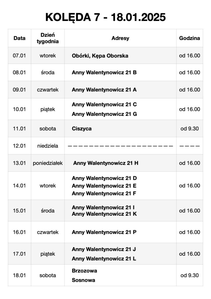 - Porządek kolędy 7 – 11 stycznia 2025: