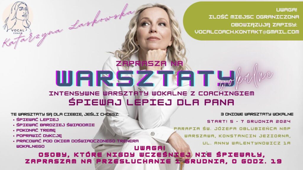 Warsztaty prowadzone przez doświadczoną trenerkę wokalną, śpiewaczkę Katarzynę Laskowską sopran. Współpracowała m.in. z wydziałem aktorskim w Warszawie (zajęcia z impostacji głosu), z chórem akademickim (konsultacje indywidualne, praca sekcyjna) oraz z zespołami i scholami. Od wielu lat, z sukcesami prowadzi indywidualny coaching wokalny, a Jej uczniowie dostają się na wymarzone uczelnie wokalne, wygrywają konkursy, biorą z powodzeniem udział w znanych programach wokalnych, a także śpiewają w chórach, scholach i zespołach.